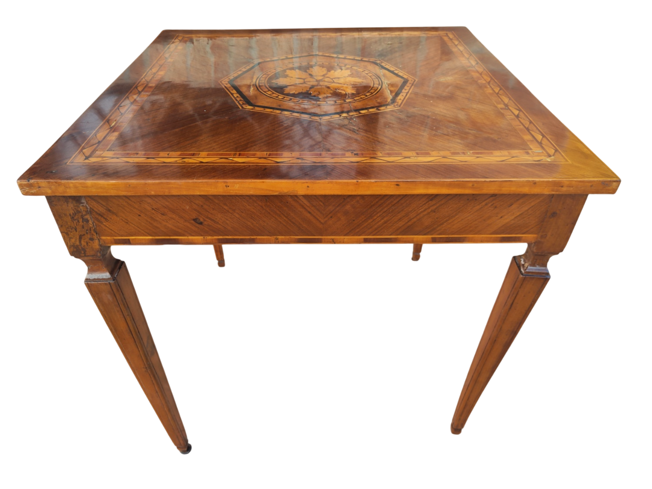 Museale e particolare Tavolo Luigi XVI intarsiato Rolo, in noce massello, e tarsie di legni vari (acero, prugno, ciliegio), risalente alla fine del XVIII° sec. Prodotto con la tecnica della tarsia a coltello, reca nel centro, il classico motivo a triangoli sovrapposti , con un motivo centrale a stella, arricchito da ombreggiature pirografate, a creare l'effetto, dell'irraggiamento solare, il tutto contornato da un riquadro, intarsiato in ciliegio e prugno, con filettature in acero. Splendido il piede troncopiramidale strozzato, ed il cassetto a tutta lunghezza in fascia. Ripristinato in patina. Nessun restauro consigliato.