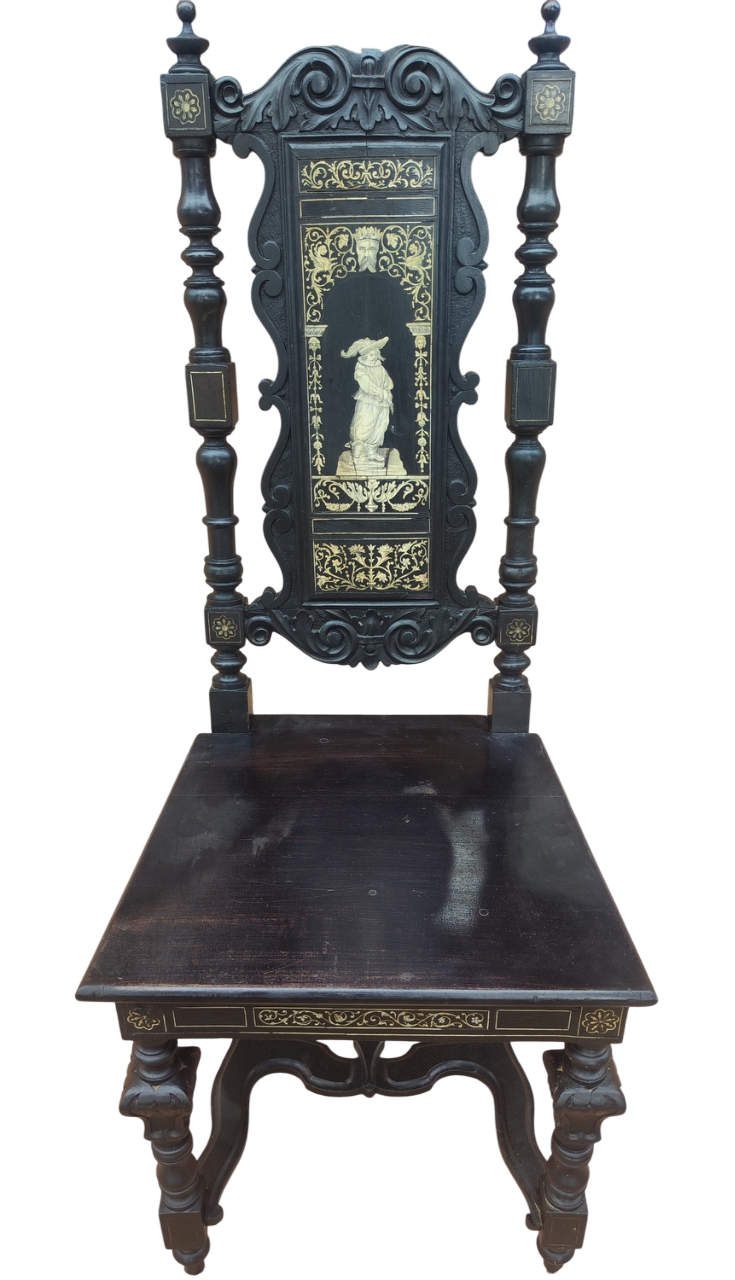 Preziosissima e rarissima Sedia ebanizzata a schienale alto in stile Neorinascimentale, prodotta in ambito Lombardo nel terzo quarto del XIX° sec. riccamente intarsiata con materiali chiari, a grottesche, chimere, trofei d'arme figure mitologiche e mascheroni. Superbo il lavoro delle colonne tornite a spirale e delle traverse sagomate ad intagli alla maniera di Pogliani, Lovati e Andreoni. Reca al centro dello schienale, la figura di un Cavaliere dell'epoca Ottimo lo stato di conservazione, stabile e robusta. Gradita la visione e l'eventuale ritiro in loco. Misure: cm 48/38 Larghezza seduta cm 44 profondità cm 47/ 115 altezza seduta ed altezza schienale Spedizione con imballo consono € 90+30% Isole